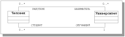 В общем случае, для ассоциации могут задаваться и ее собственное имя, и имена ролей классов. Это связано с тем, что класс может играть одну и ту же роль в разных ассоциациях, так что в общем случае пара имен ролей классов не идентифицирует ассоциацию. С другой стороны, в простых случаях, когда между двумя классами определяется только одна ассоциация, можно вообще не связывать с ней дополнительные имена. Кратностью (multiplicity) роли ассоциации называется характеристика, указывающая, сколько объектов класса с данной ролью может или должно участвовать в каждом экземпляре ассоциации (в UML экземпляр ассоциации называется соединением – link, но мы не будем здесь использовать этот термин, чтобы не создавать путаницу – все-таки трудно одновременно говорить про связи, ассоциации и соединения, имея в виду разные понятия). Наиболее распространенным способом задания кратности роли ассоциации является указание конкретного числа или диапазона. Например, указание « В более сложных (но крайне редко встречающихся на практике) случаях определения кратности можно использовать списки диапазонов. Например, список « На диаграмме классов с рис. 11.9 показано, что произвольное (может быть, нулевое) число людей являются служащими произвольного числа университетов. Каждый университет обучает произвольное (может быть, нулевое) число студентов, но каждый студент может быть студентом только одного университета.