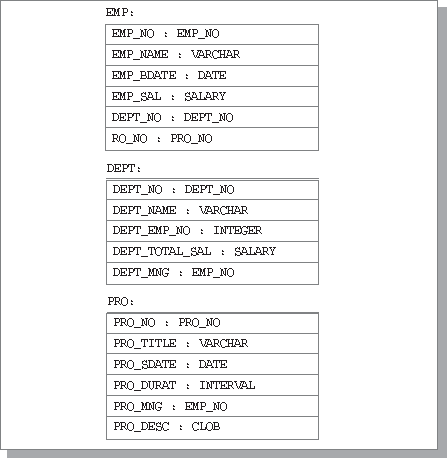 Рис. 16.1. Заголовки таблиц EMP, DEPT и PRO