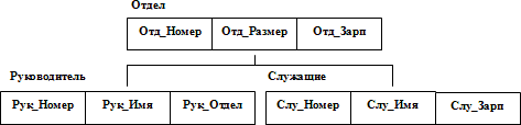 Ограничения целостностиОбщие правила определения целостности БД отсутствуют. В некоторых системах поддерживаются ограничения уникальности значений некоторых полей, но в основном вся поддержка целостности данных возлагается на прикладную программу. 2.3.2. Иерархическая модель данныхТипичным представителем (наиболее известным и распространенным) является СУБД IMS (Information Management System) компании IBM. Первая версия системы появилась в 1968 г. Иерархические структуры данныхИерархическая БД состоит из упорядоченного набора деревьев; более точно, из упорядоченного набора нескольких экземпляров одного типа дерева. Тип дерева состоит из одного «корневого» типа записи и упорядоченного набора из нуля или более типов поддеревьев (каждое из которых является некоторым типом дерева). Тип дерева в целом представляет собой иерархически организованный набор типов записи. На рис. 2.1 показан пример типа дерева (схемы