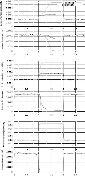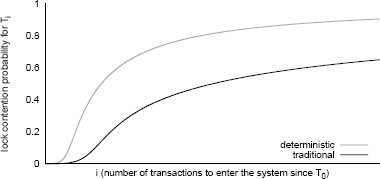 . При использовании обеих моделей выполнения на раннем этапе (до того, как много транзакций заблокируются прямо или косвенно из-за блокировок, удерживаемых T0) большинство транзакций сможет продолжать выполнение, не испытывая конфликта блокировок, так что значение k возрастает медленно. Потом застрянет большее число транзакций, загромождая менеджер блокировок и создавая цикл с положительной обратной связью, в котором уровень загромождения в течение некоторого времени экспоненциально возрастает, асимптотически приводя систему в состояние, в котором поступающие транзакции со стопроцентной вероятностью не смогут завершаться. Не удивительно, что взрывообразный рост загромождения наступает гораздо раньше в детерминированном случае, в котором даже транзакции, конфликтующие с другими транзакциями лишь по немногим записям, добавляют к набору заблокированных записей свои наборы чтения и записи целиком.