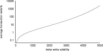 На рис. 6 показаны общая транзакционная пропускная способность и среднее число перезапусков транзакции до того, как она могла выполниться вплоть до завершения – и то, и другое как функции от средней изменчивости элементов индекса. Приведены результаты для рабочих нагрузок, включающих 0%, 20%, 40%, 60%, 80% и 100% зависимых транзакций.