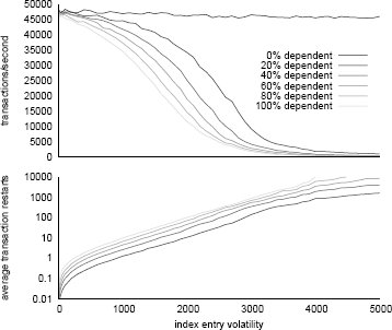 Как и следовало ожидать на рабочую нагрузку, состоящую полностью из независимых транзакций, по сути, не влияет частоты изменений индекса, в производительность более зависимых рабочих нагрузок падает по мере роста изменчивости.