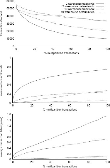Относительная стоимость возрастающей интенсивности конфликтов. Уменьшение числа складов с десяти до двух приводит к повышению интенсивности конфликтов и увеличению задержки при применении обеих схем выполнения. Влияние этого эффекта на пропускную способности ясно видно в традиционном случае. В детеминированном случае это влияние не настолько очевидно, поскольку для версии тестового набора с двумя складами демонстрируется лучшая производительность, чем для версии с десятью складами, почти для любой доли многораздельных транзакций. Однако истинное поведение системы затуманивается тем, что в случае с двумя складами лучше работает кэш. Углубленный анализ графиков показывает более резкое падение производительности при увеличении доли многораздельных транзакций в случае двух, а не десяти складов. Следовательно, возрастающая интенсивность конфликтов в случае двух скдадов при детерминированной реализации не способствует повышению производительности. В целом, мы видем, что возрастание интенсивности конфликтов при использовании обеих систем оказывает качественно одинаковое воздействие на пропускную способность. Но из-за большей величины задержки транзакций при традицонном выполнении падение производительности проявляется при гораздо меньшей доли многораздельных транзакций.