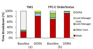 Рис. 2. Распределение времени традиционной системы обработки транзакций и прототипа DORA при полном использовании всех 64 аппаратных контекстов чипа Sun Niagara II при пропуске (a) тестового набора TM1 и (b) транзакций OrderStatus тестового набора TPC-C. В DORA используется высокопропускной механизм коммуникаций с малыми задержками между ядрами многоядерной системы. Транзакции переходят от одного потока управления к другому потоку с минимальными накладными расходами, поскольку в каждом потоке управления производится доступ к отдельной части базы данных. На рис. 2 сравнивается распределение времени традиционной системы управления транзакциями и прототипной реализации DORA при использовании всех 64 аппаратных контекстов чипа Sun Niagara II при пропуске тестового набора TM1 компании Nokia и транзакций OrderStatus тестового набора TPC-C [20]. В прототипе DORA устраняется конкуренция в менеджере блокировок (рис. 2(a)). Кроме того, централизованное управление блокировками заменяется облегченным механизмом блокирования, локальным для потоков управления (рис. 2(b)). 1.2. Вклад и организация статьиВкладом статьи является следующее: