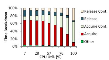 Рис. 3. Распределение времени внутри менеджера блокировок Shore-MT при выполнении тестового набора TPC-B и повышении уровня загрузки процессора. Рис. 3 показывает, на что тратится время внутри менеджера блокировок Shore-MT при выполнении тестового набора TPC-B (коэффициент использования системы возрастает по оси абцисс). В общее время включается время, тратящееся на получение блокировок, на освобождение блокировок и на обслуживание конкуренции за выполнение этих операций. Когда система загружена слабо, более 85% времени работы менеджера блокировок тратится на выполнение полезной работы. Однако по мере возрастания загрузки начинает доминировать время, уходящее на обслуживание конкуренции. При стопроцентной загрузке процессора 85% времени работы менеджера блокировок тратится на обслуживание конкуренции (циклическое опрашивание (spinning) защелок). 2 Мы используем термин логические блокировки (logical locking), а не просто блокировки (locking), чтобы подчеркнуть их отличие от защелок (latching). Защелки используются для поддержки физической согласованности структур данных в основной памяти; логические блокировки позволяют поддерживать логическую согласованность ресурсов базы данных, таких как записи и таблицы. |