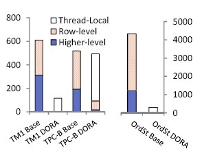 Рис. 5. Блокировки, запрошенные 100 транзакциями в базовой системе и в DORA при трех рабочих нагрузках. Далее мы численым образом оценивали, насколько эффективно DORA сокращает число взаимодействий с централизованным менеджером блокировок, и как это влияет на производительность. Мы измеряли число блокировок, запрашиваемых в базовой системе и в DORA. Мы инструментировали код для сбора данных о числе и типе запрашиваемых блокировок. На рис. 5 показано число блокировок, запрошенных 100 транзакциями при выполнении обеими системами транзакций из тестовых наборов TM1 и TPC-B, а также транзакции OrderStatus из TPC-C. Блокировки разбиваются на три типа: блокировки уровня записей, блокировки центрального менеджера блокировок, не являющиеся блокировками уровня записей (на рисунке они обозначены как "higher level"), и локальные блокировки DORA. При типичной рабочей нагрузке OLTP конкуренция за блокировки уровня записей имеет ограниченный характер, поскольку имеется очень большое число записей, доступ к которым происходит случайным образом. Но по мере продвижения вверх по иерархии блокировок можно ожидать возрастания уровня конкуренции. Например, каждой транзакции требуется получить блокировки намерений на уровне таблиц. На рис. 5 показано, что в DORA имеются лишь минимальные взаимодействия с централизованным менеджером блокировок. При выполнении тестового набора TPC-B в DORA запрашивается блокировка не уровня записей из-за управления областью хранения данных (выделения новой области страниц). Рис. 5 позволяет составить некоторое представление о поведении этих трех рабочих нагрузок. TM1 состоит из исключительно кратковременных транзакций. Для их выполнения в традиционной системе запрашивается столько же блокировок более высокого уровня, сколько и блокировок уровня записей. В TPC-B число блокировок уровня записей в два раза больше числа блокировок более высокого уровня. Следовательно, можно ожидать, что при выполнении тестового набора TPC-B конкуренция в менеджере блокировок традиционной системы должна быть меньше, чем при выполнении тестового набора TM1. При выполнении транзакций OrderStatus традиционная система должна масштабироваться еще лучше, поскольку в них число блокировок уровня записей еще больше числа блокировок более высокого уровня.