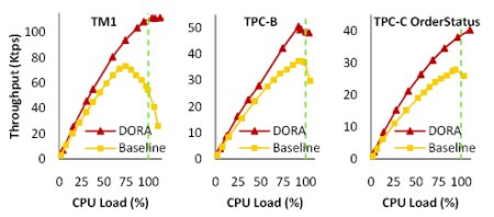 Рис. 6. Производительность базовой системы и DORA при возрастании загрузки системы при выполнении транзакций тестовых наборов TM1 и TPC-B, а также транзакций OrderStatus из TPC-C. Рис. 6 подтверждает эти ожидания. Мы представляем диаграммы производительности обеих систем при трех рабочих нагрузках. На оси абцисс показана предлагаемая загрузка процессора. Предлагаемая загрузка процессора вычисляется путем сложения измеряемого времени использования процессора и времени, которое потоки управления тратят на ожидание ресурса процессора в очереди потоков управления, готовых к выполнению. Мы видим, что базовой системе свойственны проблемы масштабируемости, наиболее серьезные в случае TM1. С другой стороны, производительность DORA масштабируется настолько хорошо, насколько это позволяют аппаратные ресурсы. Когда предлагаемая загрузка процессора превышает 100%, производительность традиционной системы на всех трех рабочих нагрузках резко падает. Это происходит из-за того, что операционной системе приходится вытеснять потоки управления с процессора, и в некоторых случаях это происходит в середине конфликтных критических участков. С другой стороны, производительность DORA остается высокой; это еще раз доказывает, что в DORA число конфликтных критических участков уменьшается.