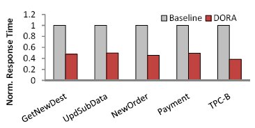 Рис. 7. Время ответа для простых транзакций. В DORA используется внутритранзакционный параллелизм, свойственный многим транзакциям. В эксперименте, результаты которого показаны на рис. 7, мы сравнивали среднее время ответа на запрос в базовой системе и в DORA, достигаемой в ситуации, когда от одного клиента поступают запросы на образование транзакций с внутренним параллелизмом из трех рабочих нагрузок, и журнал располагается в файловой системе в основной памяти. В DORA используется доступный внутритранзакционный параллелизм и достигается меньшее время ответа. Например, транзакции NewOrder из тестового набора TPC-C выполняются в среде DORA на 60% быстрее.
