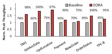 Рис. 8. Сравнение максимальной пропускной способности DORA и базовой системы на заданных рабочих нагрузках. Пиковая пропускная способность достигается при разных коэфициентах использования процессора. 5.4. Максимальная пропускная способностьКонтроль доступа (admission control) может ограничивать число выполняемых транзакций, что, в свою очередь, ограничивает уровень конкуренции внутри менеджера блокировок системы. При должной настройке контроль доступа позволяет системе достичь предельно возможной пропускной способности, даже если это означает недоиспользуемость ресурсов машины. На рис. 8 приведены результаты сравнения максимальной пропускной способности базовой системы и DORA при использовании идеального контроля доступа. Для каждой системы и рабочей нагрузки показан коэффициент использования процессора, при котором достигается максимальная пропускная способность. DORA достигает более высокой максимальной пропускной способности на всех исследованных нами рабочих нагрузках, и эта пиковая пропускная способности достигается на пределе возможностей аппаратуры.Для транзакций из тестовых наборов TPC-C и TPC-B DORA демонстрирует менее значительные преимущества. Это объясняется двумя причинами. Во-первых, этим транзакциям свойственна меньшая конкуренция внутри менеджера блокировок, что лишает DORA основного ее преимущества над базовой системой. Во-вторых, некоторые из этих транзакций (такие как NewOrder и Payment из TPC-C и TPC-B) оказывают сильное давление на менеджер журнала, который становится новым узким местом. 6. ЗаключениеНазначение каждой транзакции своего потока управления в традиционных системах обработки транзакций не позволяет им полностью использовать потенциал многоядерных процессоров. Результирующая конкуренция внутри менеджера блокировок становится препятствием на пути к достижению масштабируемости. В этой статье демонстрируется возможность подхода с назначением потоков управления данным устранить это узкое место и повысить как производительность, так и масштабируемость. По мере того, как многоядерные аппаратные средства будут все более ограничивать масштабируемость внутри менеджеров блокировок, а подход DORA будет набирать зрелость, ее отрыв от традиционных систем будет только возрастать.7. БлагодарностиМы сердечно благодарим Майкла Абд Эль Малека (Michael Abd El Malek), Кирияки Леванти (Kyriaki Levanti) и сотрудников лаборатории DIAS за их отзывы и техническую поддержку. Мы благодарны рецензентам PVLDB за их ценные отзывы на ранние варианты этой статьи. Эта работа частично поддерживалась исследовательской стипендией Sloan, грантами NFS CCR-0205544, IIS-0133686 и IIS-0713409, премией ESF EurYI и Swiss National Foundation.8. Литература[1] Anon, et al. A measure of transaction processing power. Datamation, 1985. [2] E. Bugnion, et al. Disco: running commodity operating systems on scalable multiprocessors. ACM TOCS, 15(4), 1997. [3] M. Carey, et al. Shoring Up Persistent Applications. In Proc. SIGMOD, 1994. [4] C. Colohan, et al. Optimistic Intra-Transaction Parallelism on Chip Multiprocessors. In Proc. VLDB, 2005. [5] G. DeCandia, et al. Dynamo: Amazon's Highly Available Key-value Store. In Proc. SOSP, 2007. [6] D. J. DeWitt, et al. The Gamma Database Machine Project. IEEE TKDE 2(1), 1990. [7] H. Garcia-Molina, and K. Salem. Sagas. In Proc. SIGMOD, 1987. [8] G. Graefe. Hierarchical locking in B-tree indexes. In Proc. BTW, 2007. [9] S. Harizopoulos, et al. OLTP Through the Looking Glass, and What We Found There. In Proc. SIGMOD, 2008. [10] S. Harizopoulos, V. Shkapenyuk, and A. Ailamaki. QPipe: A Simultaneously Pipelined Relational Query Engine. In Proc. SIGMOD, 2005. [11] P. Helland. Life Beyond Distributed Transactions: an Apostate's Opinion. In Proc. CIDR, 2007. [12] R. Johnson, et al. A New Look at the Roles of Spinning and Blocking. In Proc. DaMoN, 2009. [13] R. Johnson, I. Pandis, and A. Ailama