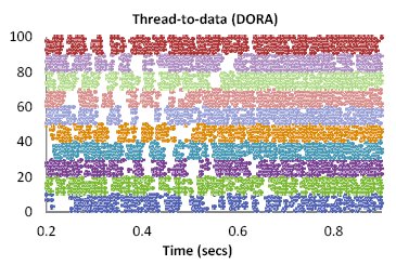 Рис. 10a. Трасса обращений потоков управления к записям в традиционной системе; обращения к данным являются некоординированными и сложными. Различие между выполнением транзакций на основе политики назначения транзакций потокам управления (т.е. традиционной политики) и политики назначения потоков управления данным (т.е. политики DORA) становится очевидным, если прибегнуть к визуальному осмотру. На рис. 10(a) показаны обращения всех рабочих потоков управления традиционной системы обработки транзакций к записям таблицы District базы данных TPC-C c 10 складами. В системе имелось 10 рабочих потоков управления, и рабочая нагрузка задавалась 20 клиентами, непрерывно запрашивающими выполение транзакций Payment из тестового набора TPC-C5, хотя трассировка производилась только в течение 0,7 секунды работы системы. Обращения к данным являются полностью некоординированными. Для обеспечения согласованности данных системе приходится использовать защелки, расходы на поддержку которых возрастают при росте уровня параллелизма системы.