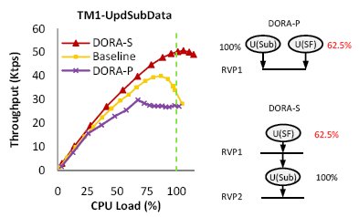 Рис. 11. Производительность при выполнении транзакции UpdateSubscriberData из тестового набора TM1, которой свойственна высокая интенсивность аварийных завершений. На рис. 11 сравнивается пропускная способность базовой системы и двух вариантов DORA при возрастании числа клиентов, постоянно запрашивающих выполнение транзакции UpdateSubscriberData из тестового набора TM1. Эта транзакция, параллельный и последовательный графы потока которой изображены в правой части рисунка, состоит из двух независимых действий. Одно действие пытается обновить таблицу Subscriber и всегда успешно завершается. Другое действие пытается обновить соответствующий элемент таблицы SpecialFacility, и это удается ему в 62,5% случаев, а в остальных случаях приводит к аварийному завершению всей транзакции из-за неверных входных данных. Мы представляем графики пропускной способности DORA при применении обеих стратегий выполнения транзакций. Параллельное выполнение обозначается как DORA-P, и последовательное выполнение, при котором сначала предпринимается попытка обновить SpecialFacility, и лишь в случае успешного завершения этого действия обновляется таблица Subscriber, обозначается как DORA-S. Как показывает рисунок, для этой рабочей нагрузки параллельное выполнение является плохим выбором. DORA-P демонстрирует худшую производительность даже по сравнению с базовой системой, в то время как DORA-S масштабируется, как и ожидалось. Менеджер ресурсов DORA отслеживает интенсивность аварийных завершений транзакций целиком и индивидуальных действий каждого исполнителя. Если интенсивность аварийных завершений становится высокой, DORA переключается на использование планов последовательного выполнения путем расстановки точек рандеву между действиями одной и той же фазы. Тем не менее, остается проблемой применение оптимизаций, специфичных для транзакций DORA. Литература к приложению[A1] B. M. Beckmann, and D. A. Wood. Managing Wire Delay in Large Chip-Multiprocessor Caches. In Proc. MICRO, 2004. [A2] C. Curino, Y. Zhang, E. Zones, and S. Madden. Schism: a Workload-Driven Approach to Database Replication and Partitioning. In Proc. VLDB, 2010. [A3] J. Gray, and A. Reuter. Transaction Processing: Concepts and Techniques. Morgan Kaufmann, 1993. [A4] N. Hardavellas, M. Ferdman, B. Falsafi and A. Ailamaki. Reactive NUCA: Near-Optimal Block Placement and Replication in Distributed Caches. In Proc. ISCA, 2009. [A5] S.-W. Lee, et al. A Case for Flash Memory SSD in Enterprise Database Applications. In Proc. SIGMOD, 2008. [A6] S. Somogyi, et al. Memory Coherence Activity Prediction in Commercial Workloads. In Proc. WMPI, 2004. [A7] S. Somogyi, T. F. Wenisch, A. Ailamaki, and B. Falsafi. Memory Coherence Activity Prediction in Commercial Workloads. In Proc. ISCA, 2009. [A8] VoltDB. Developing VoltDB Applications.