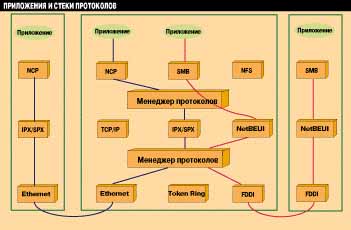 Не имей сто друзей, а имей Windows NTWindows NT как зеркало межсетевого взаимодействия.Наталья Олифер и Виктор ОлиферДВА ПОДХОДА К ВЗАИМОДЕЙСТВИЮ WINDOWS NT МУЛЬТИПЛЕКСИРУЕТ НА ВСЕХ УРОВНЯХ ШЛЮЗ WINDOWS-NETWARE БОГАТСТВО ВЫБОРА И ПРОБЛЕМА БУРИДАНОВА ОСЛА МУЛЬТИПЛЕКСОР ПРОТИВ ШЛЮЗА - ЗА И ПРОТИВ НАПРАВЛЕНИЕ СОГЛАСОВАНИЯ ГДЕ ВСЕ ЭТО РАЗМЕЩАТЬ? Одной из основных целей, которую компания Microsoft преследовала, создавая операционную систему нового поколения (NT - New Technology), было завоевание рынка сетевых ОС для корпоративных серверов, который тогда прочно удерживала (и в той или иной степени продолжает это делать по сей день) сетевая ОСNovell NetWare. Так как одна из основных особенностей корпоративной сети- это ее неоднородность, то Windows NT в качестве претендента на роль лидерасреди серверных сетевых операционных систем просто обязана была поддерживать кроме родного стека коммуникационных протоколов NetBEUI/SMB и другие наиболее популярные стеки, среди которых TCP/IP или IPX/NCP, а также обеспечивать возможность легкого включения других стеков, поставляемых третьими фирмами. ДВА ПОДХОДА К ВЗАИМОДЕЙСТВИЮСуществует два основных способа построения продуктов межсетевого взаимодействия, которые во многом определяют их потребительские характеристики. Первый способ согласования разнородных сетей состоит в установке нескольких дополнительных стеков протоколов на одной из конечных машин, участвующих во взаимодействии. Такой подход называется мультиплексированием стеков протоколов. Компьютер с несколькими стеками протоколов использует для взаимодействия с другим компьютером тот стек или тот протокол, который понимает этот компьютер, то есть выбирает язык, понятный его собеседнику. При мультиплексировании протоколов реализуется отношение "один-ко-многим", то есть один клиент с дополнительным стеком может обращаться ко всем серверам, поддерживающим этот стек, или один сервер с дополнительным стеком может предоставлять услуги многим клиентам. Стеки мультиплексируются как целиком, так и по частям - протоколами отдельных уровней. Хотя в стандартной модели взаимодействия открытых систем OSI определено семь уровней, коммуникационные средства реальных систем обычно подразделяются на три уровня. Нижний уровень составляют драйверы сетевых адаптеров, реализующие функции канального уровня модели OSI, на среднем уровне работают так называемые транспортные средства, выполняющие функции сетевого и транспортного уровней. Верхний уровень образуют серверы и редиректоры, выполняющие функции сеансового, представительного и прикладного уровней модели OSI. Если в системе предусматривается мультиплексирование средств каждого из трех уровней, то диалог между компьютерами может поддерживаться, например, протоколом SMB на верхнем уровне, протоколами TCP и IP на среднем уровне и протоколом Ethernet на нижнем уровне. Для организации связей между различными протоколами на каждом уровне вводится дополнительный компонент, называемый мультиплексором или менеджером протоколов. Мультиплексор осуществляет стыковку пар протоколов двух соседних уровней в зависимости от потребностей приложений (заметим, что на верхнем уровне мультиплексор соединяет приложение с различными редиректорами). Для того чтобы тот или иной компонент мог быть использован в режиме мультиплексирования, он должен быт