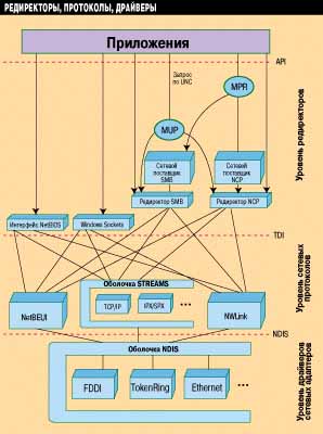 Для того чтобы один сетевой протокол мог использовать несколько канальных протоколов (реализованных в виде драйверов сетевых адаптеров) и, наоборот- один драйвер сетевого адаптера мог работать с несколькими сетевыми протоколами, в Windows NT на нижнем уровне используется мультиплексор NDIS (NetworkDriver Interface Specification), новая 32-разрядная версия которого 3.0 была разработана специально для Windows NT. NDIS выполняет не только функции мультиплексора, но и функции программной среды, изолирующей драйвер сетевого адаптера от аппаратуры, то есть от самого сетевого адаптера. NDIS предоставляет разработчику драйвера функции управления сетевым адаптером, например функции ввода/вывода или обработки прерываний, что делает код драйвера более мобильными переносимым. Windows NT поддерживает драйверы сетевых адаптеров не только в стандарте NDIS, но и в популярном стандарте ODI, используемом в сетях Novell NetWare. На среднем уровне Windows NT вводит свой стандарт на интерфейс транспортных протоколов - TDI (Transport Driver Interface). "Наличие слова Driver" свидетельствует о том, что в Windows NT эти протоколы реализованы в виде драйверов системы ввода/вывода. Если редиректоры и транспортные протоколы написаны в соответствии с правилами TDI, то они могут образовывать произвольные связи между собой, то есть мультиплексироваться. Разработчикам приложений для доступа к функциям транспортного уровня Windows NT предлагает два популярных API - NetBIOS и Windows Sockets, которые, в свою очередь, обращаются к транспортным протоколам через интерфейс TDI. Кроме собственных отдельных драйверов, разработанных в стандарте TDI (например NetBEUI), Windows NT использует также модифицированную среду STREAMS, созданную в свое время знаменитым Денисом Ритчи для операционной системы Unix. Изменения среды STREAMS заключались в согласовании ее верхнего уровня с интерфейсом TDI, что позволило использовать в Windows NT значительную часть кодов уже разработанных транспортных протоколов для этой среды. На верхнем уровне в Windows NT имеется два мультиплексора - MUP и MPR, соответствующие двум сценариям доступа приложений к сетевым ресурсам в гетерогенной сети. Первый сценарий состоит в том, что приложение обращается к операционной системе с запросом, указывая в явном виде имя сетевого ресурса без предварительной установки соединения. Такой запрос может быть выполнен при условии, что имя задано в соответствии с универсальным соглашением об именовании UNC (Universal Naming Convention). В имени UNC сначала указывается имя сервера, предваряемое двумя слэшами, а затем сетевое имя разделяемого каталога и составное имя файла. Например, приложение может открыть файл, используя имя \\tandem\C$\Ann\article.doc,где tandem - имя компьютера, C$ - сетевое имя разделяемого каталога, назначенное пользователем или системой, \Ann\article.doc - составное имя файла относительно каталога C$. Когда подсистема ввода/вывода Windows NT анализирует имя файла и обнаруживает, что оно является UNC- именем, то вызывается MUP (Multiple UNC Provider), которому это имя передается для дальнейшей обработки. В обязанности MUPвходит определение принадлежности сетевого ресурса с заданным именем той или иной сети, инсталлированной в системе. Если обращение по этому имени происходит впервые, то MUP просто передает его для опознания всем редиректорам, которые установлены в системе (их список имеется в базе конфигурации системы Registry). Каждый редиректор в соответстви