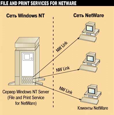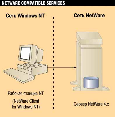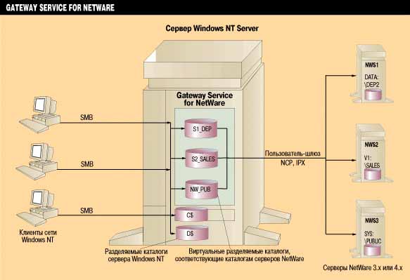 2. Другой основной функцией MPR является мультиплексирование связей между приложением и несколькими редиректорами. Если приложение не делает запрос на доступ к сетевому ресурсу в явном виде по UNC-имени, а хочет сначала просмотреть и/или отобразить ресурсы, то такой запрос попадает сначала в MPR, который переправляет его нужному редиректору. Запросы от приложений могут явно указывать, с каким типом сети нужно работать - в этом случае MPR просто передает запрос указанному редиректору. Если же в запросе тип сети не указан, то MPR поступает так же, как и MUP, - он передает запрос для опознания ресурса всем редиректорам и ждет от них ответы. MPR взаимодействует с редиректорами не непосредственно, а через промежуточные компоненты, называемые сетевыми поставщиками услуг (network provider). Эти промежуточные компоненты обеспечивают согласование исходного интерфейса каждого редиректора с единым стандартным интерфейсом, с помощью которого MPR общается с редиректорами. Таким образом, для включения в Windows NT нового типа сети нужно разработать два компонента - редиректор и сетевой поставщик услуг. Разделение обязанностей между сетевым поставщиком услуг и редиректором- их внутреннее дело, главное, чтобы поставщик поддерживал стандартный интерфейс с MPR. Встроенный поставщик сети Microsoft для получения списка доменов, рабочих групп и компьютеров обращается к сервису Computer Browser, а список разделяемых каталогов на сервере получает с помощью редиректора. При отображении разделяемого каталога на локальный дисковод, например \\tandem\C$ на F:, поставщик услуг сам создает в дереве имен объектов Windows NT новый объект - символьную связь с именем F:, которая указывает на редиректор сети Microsoft. После создания такой связи работа мультиплексора MPR по поддержке доступа к файлам (и подкаталогам) каталога F:\ закончена. Теперь эти обращения будут обрабатываться системой ввода/вывода Windows NT, которая, разбирая имя файла, обнаружит, что диск F: - это не реальное устройство, а символьная связь, и вызовет для дальнейшей обработки указанный в символьной связи нужный редиректор. ШЛЮЗ WINDOWS-NETWAREПользуясь Windows NT и другими продуктами Microsoft на ее основе, администратор может выбрать для работы с "чужеродными" сетями решение без использования мультиплексоров протоколов на клиентских компьютерах, а именно шлюз. В Windows NT Server есть один встроенный шлюз Gateway Service for NetWare, естественно, для доступа к серверам NetWare; другие шлюзы нужно приобретать как отдельные продукты. Шлюз Gateway Service for NetWare обеспечивает клиентам сети WindowsNT (а в их число входят компьютеры Windows NT Workstation, Windows for Workgroups, Windows 95 и другие) прозрачный доступ к томам и каталогам серверов NetWare 3.x и 4.x. При этом клиенты Windows NT не должны устанавливать редиректоры Net-Ware (клиентские части протокола NCP). Для доступа к файлам NetWare клиенты, используя свой "родной" протокол SMB, обращаются к серверу Windows NT, на котором работает шлюз GatewayService for NetWare. Разделяемые каталоги серверов NetWare выглядят для пользователей точно так же, как и разделяемые каталоги сервера, на котором расположен шлюз. Для того чтобы эти виртуальные каталоги выглядели как реальные, шлюз совместно с администраторами двух сетей выполняет некоторую предварительную работу.