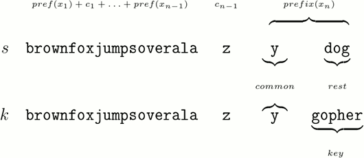 Т.е. выполняется неравенство: s(xn)≤k≤s(xn+1), где под операцией A≤B понимается то, что A является префиксом B или совпадает с ней. Процедура получает на вход указатель x на корневой узел поддерева, а также строку k. Промежуточные результаты поиска сохраняются в стек S. В процедуре также используется функция y=L(x,c), которая находит среди исходящих рёбер вершины x ребро, помеченное символом c, и возвращает узел y, в который оно ведёт, либо NIL, если такого ребра нет. Такую функцию можно реализовать, например, бинарным поиском, т.к. массив рёбер упорядочен. Также используется функция Cut(p,s), которая возвращает строку, получающуюся из s удалением префикса p. Алгоритм достаточно компактен, поэтому приведём его здесь: BST-Search(x, k, S) 1: Push(S, x) 2: if external(x) then 3: Disk-Read(J(x)) 4: return BST-Search(J(x), k, S) 5: endif 6: if not Is-Prefix(prefix(x), k)) then 7: if Is-Prefix(k, prefix(x)) then 8: return x 9: else 10: return NIL 11: endif 12: else 13: s ← Cut(prefix(x), k) 14: if Empty(s) then 15: return x 16: elseif L(x,s[1]) = NIL 17: return NIL 18: else 19: return BST-Search(L(x,s[1]), Cut(s[1], s), S) 20: endif 21: endif Процедура возвращает такой узел x, что все пути, ведущие из корня в final-вершины и содержащие x, задают строки, для которых искомая строка является префиксом, либо NIL, если такого узла нет. Таким образом, нам остаётся найти все эти пути (обходом поддерева от возвращённой вершины). 5.2. ВставкаПроцедура добавления строки устроена таким образом, что она сначала строит структуру, описывающую изменение страницы, в которую надо вставить новые вершины. Может случиться, что для вставки нет места в странице. В этом случае процедура вызывает расширение дерева на необходимую величину, и вставка не происходит. Она должна быть вызвана ещё раз. Заметим также, что корень дерева может измениться в процессе работы процедуры. Сама процедура добавления достаточно проста, однако она слишком велика, чтобы приводить её здесь. Опишем только основной подход. Начинается вставка с поиска пути по дереву к ключу k, который надо вставить. Алгоритм практически идентичен алгоритму поиска пути, только нас интересует лишь путь S, получающийся в результате. Кроме того, нам понадобятся три дополнительные строки, получаемые из найденного пути и строки k: common, rest и key. Строятся они следующим образом. Возьмём строку s, которая получилась из строки, соответствующей найденному пути S удалением последнего префикса. Она, очевидно, является префиксом добавляемой строки k (либо совпадает с ней). Будем рассматривать строку k, которая получилась из k удалением этого префикса s. Тогда common — это наибольший общий префикс строк k и p=prefix(S[n]) (где S[n] — последняя вершина пути S). rest — это остаток от строки p, полученный удалением префикса common, и key — остаток от k, полученный удалением префикса common. Все три строки удобно считать одновременно, и их значение иллюстрирует следующая схема: