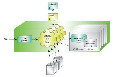 MapReduce: внутри, снаружи или сбоку от параллельных СУБД?Сергей Кузнецов 3. MapReduce внутри параллельной СУБДОчевидны преимущества клиент-серверных организаций СУБД: в такой архитектуре сервер баз данных поддерживает крупную базу данных, которая сохраняется в одном экземпляре и доступна большому числу приложений, выполняемых прямо на стороне клиентов или в промежуточных серверах приложений. Однако даже при использовании реляционной (или, правильнее, SQL-ориентированной) организации баз данных, когда от клиентов на сервер баз данных отправляются высокоуровневые декларативные запросы, в обратную сторону, от сервера к клиенту, пересылаются результирующие данные, вообще говоря, произвольно большого объема.Естественно, возникает вопрос: не окажется ли дешевле, чем пересылать данные с сервера на клиент для их дальнейшей обработки, переместить требуемую обработку данных на сервер, ближе к самим данным. Насколько мне известно, в явном виде идея перемещения вычислений на сторону сервера была высказана в статье Лоуренса Роува (Lawrence A. Rowe) и Майкла Стоунбрейкера (Michael R. Stonebraker) [38], хотя в более скрытой форме намеки на эту идею можно найти и в более ранних статьях М. Стоунбрейкера и др. [39-40], еще не имевших непосредственного отношения к СУБД Postgres. С того времени, как поддержка определяемых пользователями хранимых процедур, функций и методов, типов данных и триггеров появилась во всех развитых SQL-ориентированных СУБД, соответствующие языковые средства специфицированы в стандарте языка SQL. Более того, возникла новая проблема выбора – одну и ту же функциональность приложения можно реализовать на стороне сервера, на сервере приложений и на клиенте. Однозначных методологий и рекомендаций, способствующих простому выбору, не существует. Например, очевидно, что если услугами одного сервера пользуется несколько приложений, то перегрузка сервера хранимыми процедурами и функциями, реализующими функциональность одного приложения, может нанести ущерб эффективности других приложений. Тем не менее, во всех традиционных серверных организациях СУБД возможность переноса вычислений на сторону сервера существует и не очень сложно реализуется. Однако в параллельных СУБД (в особенности, категории sharing-nothing) дела обстоят гораздо хуже. Выполнение SQL-запросов распараллеливается автоматически оптимизитором запросов. Но оптимизатор запросов не может распараллелить определенную пользователем процедуру или функцию, если она написана не на SQL, а на одном из традиционных языков программирования (обычно с включением вызовов операторов SQL). Конечно, технически можно было бы такие процедуры и функции вообще не распараллеливать, а выполнять в каком-либо одном узле кластера. Но тогда (а) в этом узле пришлось бы собрать все данные, требуемые для выполнения процедуры или функции, для чего потребовалась бы массовая пересылка данных по сети, и (b) это свело бы на нет все преимущества параллельных СУБД, производительность которых основывается именно на параллельном выполнении. С другой стороны, невозможно обязать распараллеливать свои программы самих пользователей, определяющих хранимые процедуры или функции (например, на основе библиотеки MPI [41], которую принято использовать для явного параллельного программирования на основе обмена сообщениями в массивно-параллел