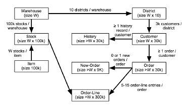 Конец архитектурной эпохи, или Наступило время полностью переписывать системы управления даннымиМайкл Стоунбрейкер, Сэмюэль Мэдден, Дэниэль Абади, Ставрос Харизопулос, Набил Хачем, Пат Хеллэнд Пересказ: Сергей Кузнецов Оригинал: Michael Stonebraker, Samuel Madden, Daniel J. Abadi, Stavros Harizopoulos, Nabil Hachem, Pat Helland. The End of an Architectural Era (It's Time for a Complete Rewrite). Proceedings of VLDB, 2007, Vienna, Austria 5. Сравнение производительностиTPC-C выполняется над схемой, показанной на рис. 1, и для этого тестового набора определяются пять классов транзакций (new_order, payment, order status, delivery и stock_level).