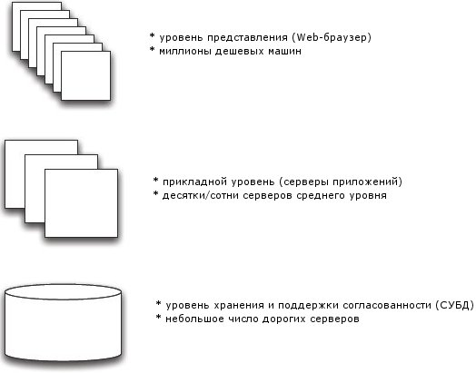 Эта архитектура практически идеально отвечает критериям оптимальности традиционных СУБД. Согласованность данных поддерживается СУБД на нижнем уровне. Основная цель оптимизации (минимизация времени отклика и максимизация пропускной способности) достигается за счет применения на всех уровнях ряда отработанных методов (индексация, кэширование, разделение и т.д.). Верхние два уровня почти неограниченно масштабируются (масштабируемость нижнего уровня ограничена). Однако целям новой оптимизации традиционная архитектура не удовлетворяет. Во-первых, она рассчитана на обеспечение ожидаемой пиковой производительности, которая может на несколько порядков превышать реальную среднюю производительность. В результате большая часть дорогостоящих аппаратных ресурсов простаивает. То же можно сказать о многих компонентах программного обеспечения СУБД, за которые приходится платить даже в том случае, когда они не требуются приложению. Во-вторых, традиционная архитектура не обеспечивает предсказуемость, поскольку при наличии многопользовательского доступа трудно понять, что происходит на уровне СУБД. В-третьих, как уже отмечалось, на нижнем уровне архитектуры масштабируемость ограничена. Наконец, не поддерживается гибкость, поскольку на всех трех уровнях используются разные модели данных и программирования (XML/HTML и скриптовые языки на верхнем уровне, объектно-ориентированный подход на среднем уровне и SQL – на нижнем уровне). Двумя принципами разработки приложений в трехзвенной архитектуре являются контроль и передача запросов. Первый принцип означает, что весь доступ к данным полностью контролируется СУБД, а второй – что как можно большая часть логики приложений должна выполняться поблизости от данных, т.е. внутри СУБД (на основе хранимых процедур, определяемых пользователями типов данных и функций), По мнению авторов, эти два принципа подрывают масштабируемость, предсказуемость и гибкость, приводят к удорожанию и усложнению СУБД (хотя вполне согласуются с целями традиционной архитектуры). Предлагаемая авторами архитектура показана на рис. 2. Здесь на нижнем уровне поддерживается только крупномасштабное распределенное хранение данных на основе, например, облачной службы Amazon S3. Согласованность данных обеспечивается на среднем уровне, причем эта согласованность не является строгой. Она поддерживается за счет применения всеми серверами приложений общих соглашений при чтении и записи данных через службу нижнего уровня.