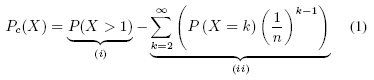 Если n > 1, и вероятность возникновения конфликта считается достаточно малой (например, не больше 1%), то вторым элементом (iv) правой части этого соотношения можно пренебречь (моделирование показывает, что при k > 3 составляющие этого элемента принебрежимо малы). Следовательно, в качестве верхней границы вероятности конфликта можно использовать значение следующего выражения: