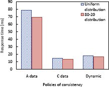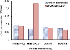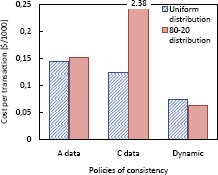 Рис. 3. Стоимость транзакции ($/1000 транзакций); изменяются гарантии Для данных категории A стоимость 1000 транзакций составляет примерно $0.15. Для данных категории C стоимость существенно зависит от распределения операций обновления. Для сильно скошенных распределений "80-20" возникает много продаж сверх имеющихся запасов из-за высокого уровня конкуренции операций записи за несколько записей данных. Для обеспечения адаптивной гарантии согласованности мы использовали Динамическую политику, поскольку она лучше всего подходит для сценария Internet-магазина. Эта политика обеспечивает наименьшую стоимость транзакций. Динамическая политика способствует нахождению правильного баланса между слабой согласованностью (позволяющей экономить расходы в время выполнения) и строгой согласованностью (гарантирующей отсутствие продаж сверх наличных запасов).
