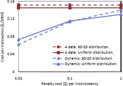Рис. 4. Стоимость транзакции ($/1000 транзакций); изменяются расходы, вызываемые несогласованностью данных На общую стоимость сильное влияние оказывает размер расходов, вызываемых несогласованностью данных. Это влияние демонстрируется на рис. 4. Для данных категории A общая стоимость транзакции при изменении размера этих расходов остается неизменной, поскольку несогласованность данных не возникает, и штрафных расходов просто нет. При возрастании размера расходов общая стоимость транзакций при применении Динамической политики приближается к стоимости транзакций с данными категории A. Динамическая политика настраивается на изменений размера штрафных расходов (см. п. 5.3.3) и при увеличении этого размера вынуждает выполняться в режиме строгой согласованности все большее число транзакций. Стоимость транзакций для данных категории C поразительно быстро растет. При увеличении размера штрафных расходов до $0.1 общая стоимость тысячи транзакций возрастает до $0.74 ($23) для равномерного распределения операций обновления (распределения "80-20"). Поэтому график возрастания стоимости транзакций для данных категории C на рис. 4 не показан. Экстраполяция результатов экспериментов с использованием Динамической политики на приложения реального мира (такие как Amazon или eBay) показывает, что этот подход может привести к значительной экономии расходов.