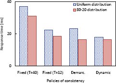 7. ЭкспериментыВ этом разделе описываются эксперименты, которые мы выполняли для изучения сравнительных характеристик разных политик согласованности. Наши эксперименты основывались на эталонном тестовом наборе TPC-W [32]. Тестовый набор TPC-W моделирует Internet-магазин и направлен на сравнение производительности разных реализаций. Для всех своих тестовых испытаний мы сообщаем время ответа и стоимость транзакции. Эти результаты демонстрируют высокий потенциал рационализации согласованности.7.1. Экспериментальная средаТестовый набор TPC-W. Тестовый набор TPC-W моделирует Internet-магазин (см. наш первый сценарий использования в разд. 2). В этом тестовом наборе подразумевается, что клиенты обходят Web-сайт Internet-магазина и, в конце концов, совершают покупки. Всего имеются 14 различных действий (например, поиск товара, регистрация клиента и покупка товара) и три разных смеси этих действий. Больше всего операций обновления производится в смеси заказов (Ordering Mix), в которой 10% действий являются покупками товаров. Во всех своих экспериментах мы использовали именно Ordering Mix, чтобы получить более точные характеристики подхода рационализации согласованности.База данных, определяемая в тестовом наборе TPC-W, содержит данные восьми разных типов (например, элемент данных, содержащий информацию о продукте, включая объем его запаса). Кроме того, в тестовом наборе TPC-W требуется, чтобы все транзакции над базой данных выполнялись на уровне строгой согласованности. В своих экспериментах мы ослабляем это требование. Для изучения характеристик рационализации согласованности мы назначаем разным типам данных разные категории согласованности (см. ниже). До начала каждого эксперимента устанавливалось некоторое константное значение объема запасов каждого продукта. В тестовом наборе TPC-W определяется, что запасы продуктов должны периодически восполняться. В этом случае тестовый набор может выполняться бесконечно без возникновения ситуаций, когда объем запасов какого-либо продукта становится меньше некоторого порогового значения. Нас интересуют несогласованные состояния базы данных, в которых объем запасов какого-нибудь продукта становится отрицательным по причине параллельного выполнения не изолированных транзакций. Чтобы получить возможность оценить эти несогласованности, мы не восполняем запасы продуктов, а завершаем эксперименты по прошествии заданного времени и подсчитываем число продаж сверх имеющихся запасов. Все эксперименты выполнялись в течении 300 секунд и повторялись по 10 раз. В смеси Ordering Mix 10% всех действий являются действиями по покупке товаров. В одном действии покупки может быть приобретено сразу несколько видов продуктов. Общее число видов товара, приобретаемых за одну покупку, является случайной целой величиной со значениями от 1 до 6 (включительно). Т.е. за один раз можно приобрести не более 6 видов продуктов. Число единиц товара, которые можно приобрести при покупке данного вида товара, подчиняется правилу 80-20 [15]. Мы реализовали это правило с использованием автомодельного распределения (self-similar distribution) Джима Грея (Jim Gray) с параметрами h = 0.2 и N = 4 [15]. За одну покупку можно приобрести не более 4 единиц одного вида товара. Распределения данных по категориям. В своих экспериментах мы изучали влияние параметров категоризации. Разные типы данных 