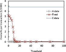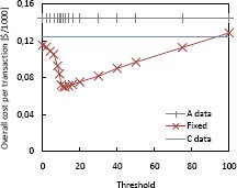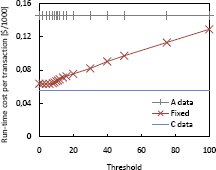 Рис. 8. Расходы времени выполнения (в долларах) при изменении порогового значения На рис. 8 приведены денежные показатели стоимости в расчете на 1000 транзакций при использовании Политики с фиксированным пороговым значением над данными категорий A, B и C. Мы изменяли пороговое значение. Поскольку это пороговое значение несущественно для данных категорий A и C, стоимость транзакций над такими данными остается неизменной. Расходы времени выполнения для данных категории B увеличиваются при возрастании порогового значения. Чем выше пороговое значение, тем раньше эта политика переключится на уровень строгой согласованности, который вызывает значительно больше накладных расходов (например, из-за потребности в блокировках и посылки большего числа сообщений).
