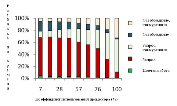 Рис. 7. Разбивка по времени работы менеджера блокировок Shore-MT при выполнении тестового набора TPC-B. На рис. 7 показана разбивка по времени работы менеджера блокировок Shore-NT при возрастании коэффициента загрузки процессора. Как видно, при слабой загрузке системы 85% времени менеджер блокировок выполняет полезную работу. Однако по мере роста загруженности процессора растут расходы на обслуживание конкуренции потоков управления. При стопроцентной загрузке процессора 85% времени работы менеджера блокировок уходит на выполнение операций над защелками. 3.2.2 Архитектура DORAОсновные идеи DORA (Data-ORiented Architecture) состоят в следующем: