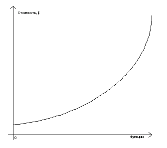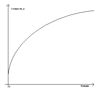 То есть, по мере увеличения количества требуемых от ПО функций, возрастает и стоимость, причем не линейно, а в основном в области большого количества функций и их повышенной сложности. Для ПО второй группы график роста стоимости внедрения примерно таков:
