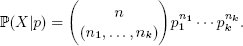 Пример: полиномиальное распределение Полиномиальное (multinomial) распределение является расширением биномиального распределения. Рассмотрим случайную переменную X с k дискретными исходами. Для них имеются вероятности p = (p1, ...,pk1). При n попытках суммарное распределение вероятности выражается следующим образом: