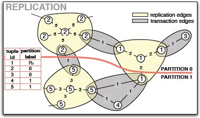 Рис. 3. Граф с репликацией. На рис. 3 показано расширение основного представления графов, отражающее возможность репликации на уровне кортежей. Репликация представляется путем "развертывания" вершины, представляющей некоторый кортеж, в звездообразную конфигурацию из n+1 вершин, где n – число транзакций, обращающихся к соответствующему кортежу. В качестве примера рассмотрим кортеж Мы экспериментировали с другими представлениями графов, включая гиперграфы, но обнаружили, что для наших целей они недостаточно пригодны (дальнейшие подробности относительно нашего графового представления см. в Приложении B). Стратегия разделения графов, обсуждаемая в следующем подразделе, эвристическим образом минимизирует стоимость разрезания графа, балансируя при этом веса каждого раздела (более точно, соблюдая ограничение допустимого перекоса). Вес раздела определяется как сумма весов вершин, отнесенных к этому разделу. Следовательно, путем назначения вершинам разных весов мы можем по-разному балансировать разделы. Мы экспериментировали с двумя важными показателями разбиения баз данных: (i) балансировка по размеру базы данных, когда вес вершины равен размеру соответствующего кортежа в байтах, и (ii) балансировка по рабочей нагрузке, когда вес вершины равен числу обращений к соответствующему кортежу. 4.2. Разделение графовПредставление графов в Schism характеризует как базу данных, так и операции над ней. При разделении граф расщепляется на k неперекрывающихся разделов таким образом, что общая стоимость разрезания дуг минимизируется (т.е. находится разделение с минимальными разрывами (mininimum-cut)). При этом веса разделов удерживаются в пределах допустимого отклонения от совершенной балансировки (коэффициент отклонения является параметром системы). Эта операция над графом приближенно минимизирует число распределенных транзакций, распределяя нагрузку или данные поровну между узлами.Наше единообразное представление разделения и репликации позволяет алгоритму разделения графов для каждого кортежа принимать решение о том, следует ли реплицировать его в нескольких разделах (как, например, кортеж 1 на рис. 3) и нести затраты на выполнение распределенных оперцаций обновления, или же лучше хранить его в одном разделе (как, например, кортеж 4 на рис. 3) и нести расходы на выполнение распределенных транзакций. Если все реплики некоторого кортежа оказываются в одном разделе, этот кортеж не реплицируется. В противном случае принимается решение о его репликации. Естественно, алгоритм разделения не принимает решения о репликации кортежей, которые часто обновляются, поскольку разрывы дуг, соединяющих вершины-кортежи с вершинами репликами, обладают высокой стоимостью, соответствующей стоимости распределенных обновлений. И наоборот, велика вероятность репликации редко обновляемых кортежей, если это приводит к снижению стоимости разрыва дуг транзакций. В подразделе 4.3 мы обсуждаем, каким образом подход к принятию решений на уровне кортежей можно обобщить для принятия решений при разделении на уровне таблиц или по диапазонам значений. Известно, что разделение графа на k частей при наличии ограничений – это NP-полная проблема. Однако, поскольку подобные разделения часто требуются в области автоматизиции проектирования сверхбольших интегральных схем, 