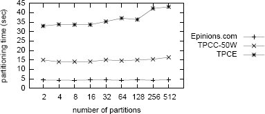 Рис. 5. Масштабируемость реализации разделения графов METIS при росте числа разделов и размеров графа. На рис. 5 показано время работы последовательной реализации алгоритма разделения графов Наиболее важной эвристикой для сокращения размеров графов является взятие образцов (sampling). Трудно точно сказать, до какого уровня можно довести взятие образцов при построении графа, чтобы с его помощью все еще можно было получать хорошую схему разделения базы данных. Однако наши эксперименты свидетельствуют о том, что Schism производит хорошие результаты даже при работе с небольшим образцом базы данных. Например, для TPC-C с двумя складами образца, состоящего из одного процента вершин и дуг полного графа, нам хватило для того, чтобы произвести такой же результат, что и при разделении вручную. Качественный анализ наших экспериментов показывает, что минимально требуемый размер графа возрастает по мере роста сложности рабочей нагрузки, размера базы данных и числа разделов. Интуитивно ясно, что для более сложной рабочей нагрузки требуется тщательно моделировать большее число транзакций (и тем самым дуг). Для базы данных большего размера в графе требуется больше вершин (кортежей). Требуется и больше дуг (т.е. больше транзакций), чтобы в графе правильно отражалось то, как производится доступ к данным. Наконец, чем больше разделов, тем более плотным должен быть граф (больше дуг). К сожалению, для формализации всего этого в виде количественной модели требуется более полный набор примеров, и такая работа находится за рамками данной статьи. Простая стратегия выбора степени сэмплинга состоит в том, чтобы пропускать нашу систему над образцами увеличивающегося размера до тех пор, пока качество разделения не перестанет повышаться. В наших простых примерах эта стратегия привела к хорошим результатам.