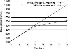 Рис. 6. Масштабируемость пропускной способности TPC-C. 6.3. Сквозная проверкаЧтобы проверить свой сквозной подход и продемонстрировать, что Schism производит сбалансированные разделы, максимизирующие пропускную способность, мы пропускали тестовый набор, основанный на TPC-C, на кластере из 8 машин (подробное описание конфигурации см. в Приложении A). Мы использовали Schism для разделения базы данных на 1, 2, 4 и 8 разделов. Затем каждому разделу назначался отдельный кластер. Система Schism конфигурировалась в расчете на балансировку нагрузки между разделами, что в случае TPC-C приводит также к образованию разделов с почти одинаковыми размерами данных. Произведенные системой предикаты разделения по диапазонам были такими же, как полученные в описанных ранее экспериментах с TPC-C. Мы использовали две конфигурации. В первой из них 16 складов распределялись по узлам кластера. Это демонстрирует горизонтальное масштабирование одного приложения при добавлении больших аппаратных ресурсов. Во второй конфигурации одновременно с добавлением узлов мы добавляли и склады, так что на каждой машине всегда имелись данные о 16 складах. Это демонстрирует возможность Schism поддерживать рост масштаба приложения при добавлении аппаратуры. Использовалось достаточное число клиентов TPC-C, чтобы можно было насытить пропускную способность TPC-C. Пропускная способность показана на рис. 6.Результаты показывают, что при наличии 16 складов один сервер способен достичь пропускной способности в 131 транзакцию в секунду. При горизонтальном масштабировании этой конфигурации производительность возрастала почти линейно при росте числа машин до четырех, но при наличии восьми машин достигалось повышение пропускной способности только в 4,7 раза. Это объсняется тем, что реализации TPC-C свойственны конфликты, которые образуют узкое место при хранении в одной машине данных только о двух складах. Невозможно насытить пропускную способность какой-либо одной машины, поскольку почти все транзакции конфликтуют, и это ограничивает максимально возможную пропускную способность. В конфигурации с постоянным хранением в каждой машине данных о шестнадцати складах это узкое место не возникает, и в этом случае демонстрируемая масштабируемость очень близка к линейной (при использовании восьми машин пропускная способность увеличивается в 7,7 раза – коэффициент 0,96). Этот эксперимент показывает, что Schism может произвести высококачественную схему разделения, позволяющую добиться хорошей масштабируемости. Наши результаты показывают, что при применении к этой рабочей нагрузке хэш-разделения, мы получили бы 99% распределенных транзакций, что привело бы к значительному уменьшению пропускной способности. 7. Родственные работыМетоды разделения баз данных активно исследовались как для одномашинных серверов (например, [1]), так и для систем без совместно используемых ресурсов (например, [23, 18]). В этих подходах обычно используется схема базы данных для получения возможных разделений по диапазонам значений или хэш-разделений, которые затем оцениваются с применением эвристик или оценочных моделей. Обеспечивается ограниченная поддержка рабочих нагрузок OLTP, и обычно отсутствует возможность генерации осмысленных стратегий разделения для схем, содержащих несколько связей n-к-n.Стохастический подход Цангари