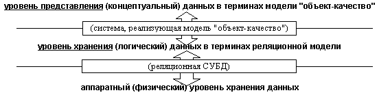 Модель "объект-качество" подразумевает, что точно так же в качестве базового типа в объектных системах можно использовать отношение с арностью большей, чем 1. Качественные атрибуты объектов.Значение атрибута объекта как значение отношения. Как мы уже отмечали, атрибуты объектов могут представлять собой группу повторения и этим отличаются от атрибутов отношений, значения которых должны быть атомарными. Здесь понятие "группа повторения" берется в самом широком смысле, т.е. речь идет о множестве значений одинакового типа. В модели "объект-качество" это отличие приобретает строгий характер. Любой атрибут объекта будем рассматривать с логической точки зрения как группу повторения (даже в том случае, когда эта группа содержит всего один элемент или не содержит их вообще). Поскольку отдельные значения качества, входящие в эту группу повторения, являются кортежами нормализованного отношения, то значение любого атрибута можно рассматривать как одно из возможных состояний этого отношения или, употребляя терминологию Дейта, как возможное значение этого отношения. Соответственно атрибут можно рассматривать как переменную отношения. Надо заметить, что значение качества и значение качественного атрибута объекта - это не одно и тоже, даже когда речь идет об одном и том же качестве (типе) Q. Значение качества - это кортеж отношения (скалярное значение качественного типа Q). Значение же качественного атрибута - это множество таких кортежей и его можно рассматривать как значение отношения Q. Однако источником этих значений (значения качества и значения отношения, являющегося атрибутами объекта) является одно и тоже множество Q. Домен Q, на котором определено значение качества, есть ни что иное, как отношение, переменной которого является атрибут объекта. Теперь можно сказать о важнейшем отличии между традиционными реляционными системами и подходом, предлагаемым моделью "объект-качество". В традиционных реляционных системах отсутствует разницы между понятиями "отношение" и "переменная отношения". Например, Дейт, определяя понятие "отношение", говорит, что "отношение - это не очень точный термин; более точным является термин переменная отношения". Судя по этому можно сказать, что Дейт имеет в виду, что каждому отношению соответствует только одна и только одна переменная отношения, и любое отношение в каждый момент времени может иметь одно и только одно значение. В отличие от этого модель "объект-качество" подразумевает, что в системе одновременно может существовать произвольное число значений одного и того же отношения и, соответственно, произвольное число служащих для их хранения переменных - ведь в системе может существовать произвольное число объектов, и в каждом из этих объектов может быть несколько атрибутов одного и того же качественного типа. Понятие "отношение" является эквивалентом понятия "тип"; его нельзя смешивать с понятием "переменная отношения" которое описывает область памяти (здесь "память" - очень абстрактное понятие) служащую для хранения одного из множества возможных значений этого типа. Надо подчеркнуть, что такой подход никак не противоречит реляционной модели данных. В самом деле, Кодд, определяя реляционную модель, говорил, что она состоит из