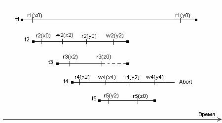 Рис 1. Пример работы планировщика MVTO Взаимодействие транзакций t1 и t2 отличным образом иллюстрирует плюсы использования версий. В случае подобного плана выполнения транзакций при отсутствии версионности мы получили бы классический случай чтения несогласованных данных. Однако в нашем примере эта ситуация вполне приемлема из-за того, что первая транзакция читает «старую» версию элемента данных y. Транзакция t3 ожидает окончания работы t2 перед собственным завершением (на рисунке это показано пунктирной линией). Это происходит потому, что t3 прочитала незавершенную (uncommited) версию x2. Транзакция t4 является примером “поздней” транзакции изменения (“late” writer). Она создает версию y4, в то время как транзакция t5 (стартовавшая позднее) уже прочитала более раннюю версию y2. То есть транзакция t5 “не видит” некоторых изменений, внесенных t4. Таким образом, сериализация транзакций в порядке получения ими временных меток становится невозможной. Именно поэтому мы вынуждены произвести откат. Это поясняет пункт 2a алгоритма. 3. Многоверсионный вариант двухфазного протокола синхронизации (Multiversion Two-Phase Locking Protocol, MV2PL)В этом разделе мы рассмотрим вариант широко известного двухфазного протокола синхронизации транзакций (2PL), адаптированного для применения в версионной базе данных. Рассматривая алгоритм работы MVTO-планировщика, мы использовали ряд терминов, которые теперь определим строго. Будем различать три типа версии элемента данных.