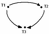 Рис 2. Граф сериализации для плана S, составленный по правилам SGT. Этот граф ацикличен. Однако для S не существует эквивалентного моноверсионного последовательного расписания. Действительно, Поскольку t3 читает версию x, записанную t1 (r3[x1]), то t2, которая тоже пишет элемент x (w2[x2]), должна следовать в моноверсионном последовательном расписании либо после t3, либо перед t1. Но первый вариант невозможен из-за шага r3[z2], а второй – из-за r2[y1]. Таким образом, многоверсионный планировщик должен также специальным способом проверять согласованность шагов, создающих новые версии. Для этого в граф добавляются дополнительные дуги, которые фиксируют “позиции записи” в соответствующем последовательном расписании. Теперь мы можем описать общую схему работы MVSG-планировщика. Когда очередной шаг pi(x) поступает планировщику, он предпринимает следующие действия: