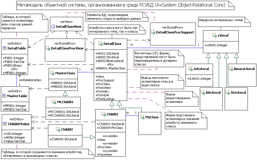 Рассмотрим реализацию описанных принципов организации объектной системы, удовлетворяющую выделенным критериям оптимальности на гипотетическом примере (рис. 1). Рис. 1. - Принципы организации объектной системы в РСУБД Рисунок требует пояснений. В левой части рисунка расположены две таблицы (MasterTable(главная) и DetailTable (подчинённая)), объединённые связью "один-ко-многим". Для организации такой связи в DetailTable присутствует внешний ключ MFld01, который ссылается на первичный ключ таблицы MasterTable (поле MFld01). Отметим, что все поля таблиц описаны с помощью встроенных типов данных целевой РСУБД (Microsoft SQL Server 2005). В соответствии с КО3 каждая из таблиц трансформируется в классы. При этом каждый класс становится корневым для своей иерархии и предоставляется возможность объявить производные классы (КО5). Суть в том, что все экземпляры иерархии данного и производных классов сохраняются в этой таблице. Такой подход напоминает реализацию метода ОРО «Наследование с одной таблицей (Single Table Inheritance)» [1,3], однако, в нашем случае в таблице присутствуют только атрибуты корневого класса. Значения атрибутов производных классов сохраняются в одной общей таблице ChildAttValue. Состав и структура полей данной таблицы соответствует хорошо известному методу ОРО, названному "Сущность-Атрибут-Значение" (САЗ) [4]. В отличие от классической реализации, использующей для сохранения значений атрибутов всех классов иерархии единую таблицу, в нашем случае в ChildAttValue сохраняются только значения атрибутов производных классов. В итоге мы реализовали метод, который комбинирует в себе архитектурные решения двух известных паттёрнов ОРО. Этот подход имеет следующие преимущества:
