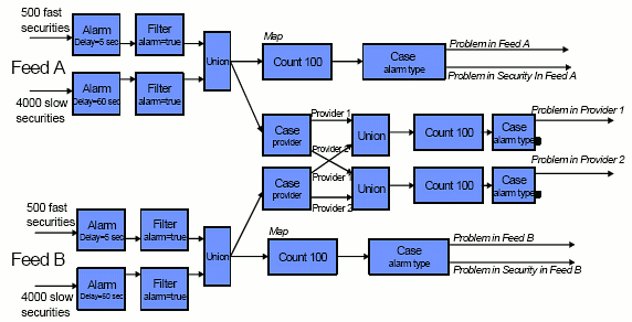 Конечно, может возникнуть вопрос «А не может ли и СУБД производить входную обработку?». СУБД исходно разрабатывались, как серверы выходной обработки данных, но много лет спустя в них были внедрены механизмы триггеров. Для триггеров имеется много ограничений (например, число триггеров, ассоциируемых с одной таблицей), и отсутствует какой-либо способ гарантирования безопасности набора триггеров (т.е. гарантирования того, что при выполнении триггеров не образуется бесконечный цикл). Во всех системах имеется очень ограниченная (или отсутствует вовсе) поддержка программирования триггеров. Например, невозможно увидеть, какие триггеры уместны для данного приложения, и отсутствует возможность добавления триггера к таблице средствами графического пользовательского интерфейса. Кроме того, виртуальные и материализованные представления могут определяться для обычных таблиц, но не для триггеров. Наконец, в существующих серверах триггеры часто вызывают проблемы производительности. Когда инженеры StreamBase попытались применить триггеры в приложении Feed Alarm, они не смогли обработать более 900 сообщений в секунду. В целом, триггеры встраивались в существующие разработки задним умом, и в существующих системах они являются жителями второго сорта. По-другому это различие можно представить следующим образом. Серверы с выходной обработкой сначала сохраняют данные, а затем выполняют запросы над этими данными. Системы же с входной обработкой сначала сохраняют запросы, а затем пропускают сквозь эти запросы входящие данные (сообщения). Хотя представляется возможным сконструировать некоторый сервер, который могли бы функционировать и в режиме входной обработки, и в режиме выходной обработки, для этого требуется дополнительная исследовательская работа. В настоящее время СУБД оптимизируются для выходной обработки, а системы обработки потоковых данных – для выходной обработки. В приложении Feed Alarm это отличие в подходе во многом способствовало получению существенного выигрыша в производительности. 4.2 Правильные примитивыВ SQL-ориентированных системах имеется сложная система агрегации, которая позволяет пользователю производить статистические вычисления над группами записей таблицы, хранящейся в базе данных. Стандартным примером является следующий: Select avg (salary) From employee Group by departmentПри достижении последней записи таблицы обработчик запроса может инициировать агрегатные вычисления для каждой группы записей. Однако эта конструкция не слишком полезна для потоковых приложений, в которых потоки существуют бесконечно, и отсутствует понятие «конца таблицы». Поэтому в системах обработки потоковых данных SQL (или какой-либо другой язык с поддержкой агрегации) расширяется понятием временного окна. В StreamBase окна можно определять на основе датчика времени, числа сообщений или контрольных точек некоторого другого атрибута. В приложении Feed Alarm (рис. 3) крайний слева блок в каждом потоке является таким блоком агрегации. В этом блоке агрегации акции группируются по символам, а затем для каждой акции определяются окна на основе пар отметок 1 и 2, 2 и 3, 3 и 4 и т.д. Такие «скользящие окна» («sliding windows») часто оказываются очень полезными в приложениях реального времени. Кроме того, в StreamBase агрегаты конструируются в расчете на интеллектуальную обработку запаздыва