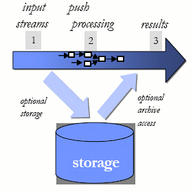 В приложениях реального времени операция сохранения данных, которая должна выполняться до их обработки, увеличивает как время задержки в приложении, так и стоимость обработки сообщения приложением. Альтернативная модель обработки, в которой удается избежать узкого места сохранения данных, показана на рис. 5. В этой модели входные потоки проталкиваются в систему (шаг 1) и обрабатываются «на лету» в основной памятью сетью запросов (шаг 2). Затем результаты выталкиваются в клиентские приложения для их конечного потребления (шаг 3). Чтение из области постоянного хранения и запись в нее являются необязательными, и во многих случаях, когда в них возникает необходимость, выполняются асинхронно. Тот факт, что область постоянного хранения отсутствует или является необязательной, позволяет сократить и стоимость обработки, и время задержки, что приводит к существенно более высокой производительности. Именно эта модель «входной» обработки используется в системе обработки потоковых данных StreamBase.