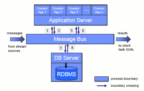 При традиционной разработке приложений обработки потоковых данных вся логика приложения распределяется между тремя разнотипными системами: (1) системой передачи сообщений (такой как MQSeries, WebMethods или Tibco), обеспечивающей надежное связывание систем-компонентов, обычно с использованием парадигмы публикации/подписки; СУБД (такой как DB2 или Oracle), обеспечивающей персистентное хранение информации о состоянии; и сервера приложений (такого как WebSphere или WebLogic), поддерживающего прикладные сервисы для набора специально написанных программ. Такая трехзвенная конфигурация проиллюстрирована на рис. 7.