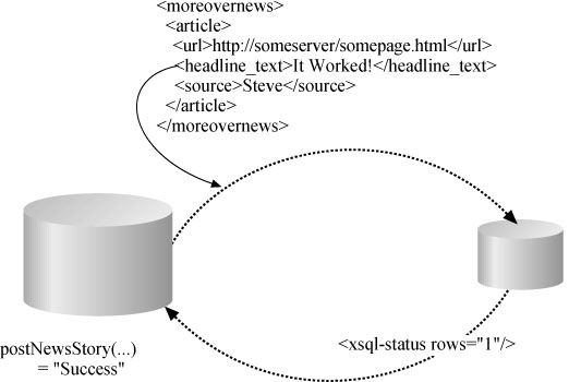 Запрашивающая сторона передает новости, в ожидаемом XML формате, подобном формату новостей Moreover.com, а сервис возвращает, основанное на XML-сообщение о статусе запроса. В этом примере, возвращаемое XML-сообщение содержит только статус сообщения, однако, дейтаграмма, возвращаемая сервером, может содержать и другую полезную информацию. На Листинге 5 представлена процедура postNewsStory, которая делает следующее: