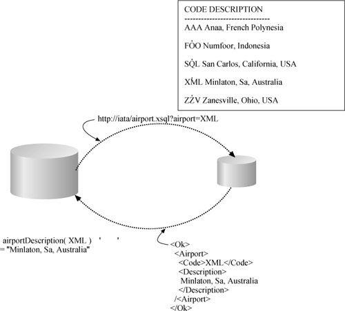 Печать значения переменной status показывает, что запрос был успешным. Далее, мы проверим пример получения (HTTP GET). Иногда Web сервисы просто принимают информацию о задаче, которую им необходимо выполнить, в качестве параметров URL. В этих случаях нет необходимости передавать какой-либо XML документ. Вместо этого мы только делаем HTTP GET на URL сервиса с соответствующим значением параметра, добавленным в конец URL. На Рисунке 2 показан обмен между нашей базой данных и Web сервисом, который позволяет нам искать название аэропорта, по трехбуквенному сокращению. База данных, запущенная на сайте, предлагающем услугу “Поиск аэропорта”, содержит трехбуквенные коды и описания более 10000 аэропортов мира. Мы можем искать наименование для некоего аэропорта с кодом XYZ, выполнив HTTP GET на URL: