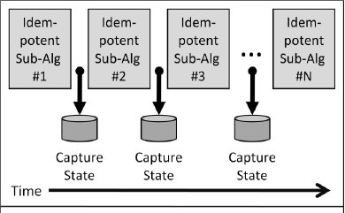 Рис. 1. Разбиение отказоустойчивого алгоритма на несколько подалгоритмов, каждый из которых является идемпотентным. За счет фиксации состояния подалгоритмов и обеспечения доступа к нему после сбоев основной алгоритм выдерживает отказы.