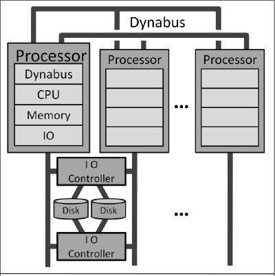 Рис. 2. Аппаратная архитектура Tandem NonStop. От 2-х до 16-ти процессоров (с основной памятью и портом ввода-вывода) объединяются двухпортовой шиной передачи сообщений Dynabus. Каждый контроллер ввода-вывода подсоединяется к двум процессорам. Зеркальные диски подключаются к избыточным контроллерам ввода-вывода. Такая архитектура позволяла выдержать любой одиночный отказ. Для выполнения своей транзакционной работы приложение запускается в одном из процессов и посылает сообщения для чтения с дисков и записи на них дисковым процессам, которые управляют данными и формируют записи для журнала транзакций. При выполнении каждой операции записи выполняется установка контрольной точки2, чтобы резервный узел мог продолжить выполнение транзакции в случае отказа основного узла, обсуживающего диск. Во время фиксации транзакции от всех DP, выполнявших операции записи, требуется выталкивание их журналов в ценральный процесс дискового аудита (Audit Disk Process, ADP ).
