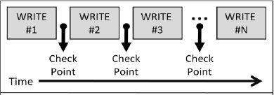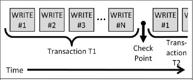 Рис. 3. В системе Tandem образца 1984 г. алгоритм каждой операция записи процесса DP является идемпотентным. Данные об этой операции посылаются основным дисковым процессом резервному процессу при установке контрольной точки. Следует обратить внимание на то, какова гранулярность элементов в этом подходе к отказоустойчивости. В 1984 г. каждая операция записи являлась идемпотентной, и для нее устанавливалась контрольная точка в резервном DP [4]. Единицей гранулярности отказа был отдельный процесс или процессор. Гранулярность "идемпотентного подалгоритма" определялась одной операцией записи, которая приводила к установке контрольной точки. Отказы основного DP не обязательно вызывали аварийное завершение транзакции (рис. 4).