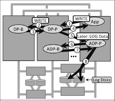 Рис. 6. В Tandem образца 1986 г. каждая операция записи локально буферизуется в основном DP. НЕ ГАРАНТИРУЕТСЯ, что данные об этой операции будут переданы резервному процессу, и отказ основного процесса приводит к аварийному завершению транзакции. Гарантируется выталкивание на диск журнала транзакции при ее фиксации. Теперь алгоритм операции записи не является идемпотентным, в качестве такого алгоритма теперь выступает транзакция. Если вернуться к абстракции отказоустойчивости, то мы видим (рис. 6), что гранулярность идемпотентного алгоритма увеличилась от размера операции записи до размера транзакции. Гранулой отказа по-прежнему является процессор, и пользователь почти не ощущает изменения общего алгоритма. 3.3 Приемлемое ослабление поведенияВ 1986 г. система Tandem демонстрировала существенно лучшую производительность, чем в 1984 г. Однако могли возникать отказы процессоров, приводящие к поведению системы, отличному от поведения предыдущего ее выпуска. Если возникал отказ процессора в середине выполнения некоторой транзакции, то в предыдущем релизе выполнение этой транзакции продолжалось. В 1986 г. отказ процессора мог привести к потере выполняемых транзакций. Хотя с технической точки зрения поведение изменилось, имелись основания считать это изменение приемлемым. С самого начала правила системы позволяли ей аварийно завершать транзакции без (видимых) причин. К аварийному завершению транзакциии могли привести синхронизационные тупики, решения операторов, срабатывание таймаутов и т.д. Поэтому это ослабление поведения системы и было приемлемым. В версии системы Tandem 1984 г. была реализована синхронная передача данных об операции записи в резервный процесс. До установки контрольной точки приложение не получало от основного DP подтверждения о выполнении операции записи. В 1986 г. записи стали асинхронными, но гарантировалось, что после фиксации транзаций отказы процессоров не вызовут потери ее данных в дисковой памяти. 4. Медленное наступление асинхронностиВ этом разделе мы увидем первый пример подтверждения поступающего запроса ДО посылки соответствующих данных в резервную копию. Это асихронная установка контрольных точек с резервной копией. Мы начнем с очень простого обсуждения "доставки журнала" (log-shipping), при которой журнал транзакций посылается в резервную систему иногда после подтверждения пользовательского запроса. Это принципиальное изменение, глубоко влияющее на гарантии, которые обеспечиваются для пользователей. После обсуждения доставки журнала мы проанализируем семантику перехвата управления при применении этого подхода. Затем мы обсудим, какого пересмотра нашей абстракции отказоустойчивости требует появление этой асинхронности. 4.1 Пример 3: доставка журналаЭтот пример должен быть хорошо известен большинству пользователей. В классической системе баз данных имеется некоторый процесс, который читает журнал и доставляет его в резервный центр данных. При обычной реализации этого механизма транзакции фиксируются в основной системе (и пользователю подтверждается выполнение запроса фиксации), и журнал доставляется асинхронно. Резервная система баз данных воспроизводит журнал, постоянно нагоняя основную систему. Обычно приложения и пользователи не обращают внимания на доставку журнала. Пока не возникают отка