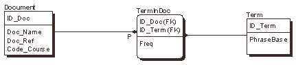 Рис.1. Логическая схема базы данных поисковой системы Дадим некоторые пояснения к ER-диаграмме (в нотации IDEF1X), представленной на рис.1. Идентификатор связи Р между таблицами Document и TermInDoc означает "один или более", т.е. любой документ должен содержать термины. По сути дела это означает, что при регистрации документа в БД всегда должно выполняться построение его терминологической базы. Если, что маловероятно, при анализе документа термины обнаружены не будут, то данный документ просто не следует включать в БД. Каждый конкретный термин из таблицы Term может содержаться в любом количестве документов. Допустимо также его отсутствие в таблице TermInDoc. Такая ситуация возможна в следующих случаях: