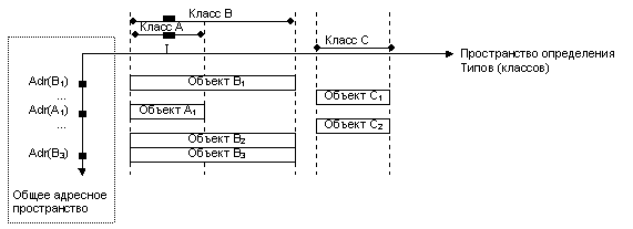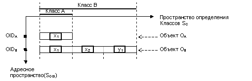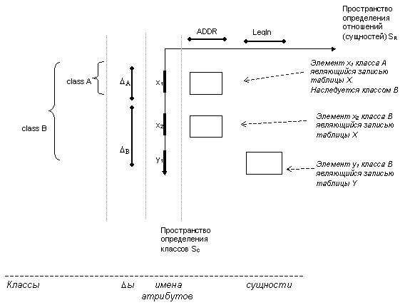 Рис. 5. O-проекция R*O-системы (Еще раз необходимо повторить, что пространство определения объектных типов является сложным и многомерным. Однако в любом случае оно может рассматриваться как проекция пространства с большим числом измерений ) Видно что данная проекция является О - системой, где каждый ее элемент (т.е. один из кортежей содержащих информацию об объекте) может быть идентифицирован выражением вида { ( адрес объекта в системе).(положение элемента в схеме (т.е. в классе) описывающей данный объект) }. Поэтому для однозначного определения элементов для каждого из них должна поддерживаться следующая информация.