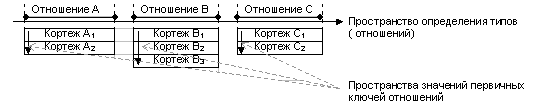 Рис 1. Простейшая реализация O-системы Для того чтобы изобразить пространство R-системы необходимо вспомнить о ключе.Это понятие является одним из основных для R-систем и определяется следующим образом: ключом отношения называют такое подмножество внутри множества имен атрибутов отношения, что кортежи отношения могут быть однозначно определены значениями соответствующих атрибутов этого подмножества. Таким образом ключ состоит из набора значений которые однозначно определяют любую строку таблицы. Определенное значение ключевого поля (или полей), принадлежащих записи некоторой таблицы, позволяет найти эту запись внутри этой таблицы.[1,4] Для однозначной идентификации кортежа Х некоторого отношения R операция ADR(X) должна вернуть выражение вида (R,K), которое звучит как "Ключ K кортежа X отношения R где R = IS(X)" . На этом определении основывается понятие внешнего ключа, который может быть назван R-аналогом ссылок и указателей O-систем. Определение подобного рода позволяет ввести в R-системы (рис. 2) механизм поддержки ссылочной целостности не позволяющий присвоить ссылке(внешнему ключу) значение выходящее из области значений первичного ключа соответствующего отношения.
