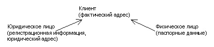 Очень важно понимать, что речь здесь идет о смысле, который присущ кортежу как атрибуту обьекта. Дело в том, что любой кортеж может обладать собственным смыслом, и этот смысл определяется отношением в которое этот кортеж входят. Кортеж сам по себе является семантически значимым набором данных. И этот осмысленный набор данных осмыслен также в контексте обьекта, атрибутом которого он является. В этом нет никакого противоречия. Рассмотрим следующий пример. Некоторая организация занимается рассылкой корреспонденции. Для каждого клиента определен адрес, по которому эту корреспонденцию нужно высылать. Клиенты могут быть как юридическими, так и физическими лицами. В контракте на обслуживание юридических лиц необходимо указывать регистационную информацию, включающую юридический адрес. В контракте для физических лиц необходимо указывать их паспорные данные. Возможная иерархия классов в О-системе моделирующей деятельность фирмы выглядит следующим образом (в скобках указана сохраняемая информация):